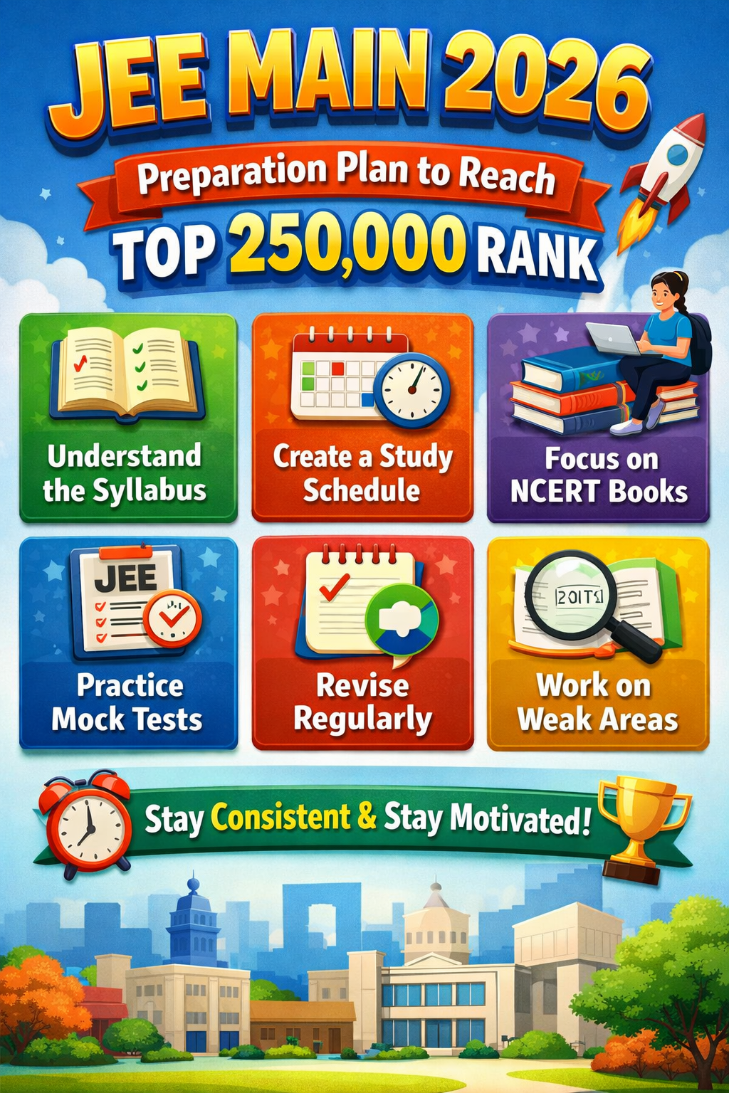 Preparing for Joint Entrance Examination Main (JEE Main) can feel overwhelming, especially with lakhs of students appearing every year. But here’s the good news — securing a rank within the Top 250000 is absolutely achievable with the right plan, consistency, and smart preparation.